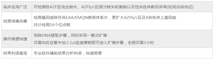 Y染色体具有大量重复基因序列及回文结构,缺失率最高的三个影响精子发生的区域被命名为AZFa﹑AZFb和AZFc,它们之中任何一个出现缺失都有可能导致育性下降或不育。据此,2004年欧洲男科学协会和欧洲分子遗传实验室质控协作网(EAA/EMQN)发表"Y染色体微缺失分子诊断指导意见",建议通过对各AZF区的共6个STS位点检测Y染色体微缺失。本试剂盒更增加可用于检测AZFb/c区部分缺失、复制及性染色体数目异常(如克氏综合症)的位点。