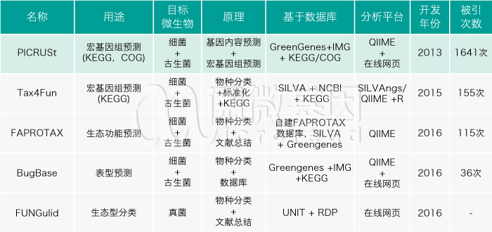上表总结出了目前微生物领域的功能预测软件,PICRUSt 推出的最早,也有着最多的引用次数,最受科研人员认可和喜欢。但随着大家对古菌、真菌等多种非细菌群体的关注和注释数据库的更迭,也不断有其他新的算法推出。