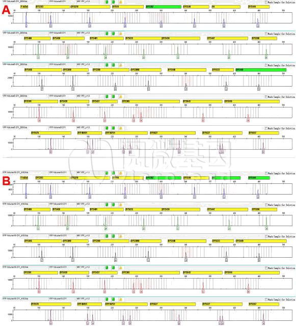 所以,在实际工作中,我们不能用统一的标准来判定不同基因座的影子峰。尤其是案件试剂盒,鉴于现场样本常存在混合样本和外源DNA污染,对影子峰的判定和排除更为关键。作为试剂盒的生产者,我们需要告诉用户阅微基因试剂盒不同基因座的影子峰表现情况,便于用户使用。