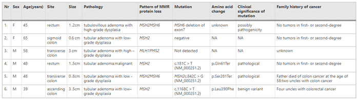朱方超等人[2]对大肠息肉LS筛查策略的研究中,对508例常规腺瘤进行分析,6例腺瘤为dMMR,占所有腺瘤的1.18%。6例腺瘤的发病位置无明显差异,平均年龄50岁,腺瘤平均大小1.7 cm,其中2例腺瘤高度不典型增生,一例伴有恶性成分,其余两例没有进展但有癌症家族史。5例患者进行了MMR基因检测,结果两例为致病性突变,一例疑似致病性突变。文章得出结论:可以通过选择患者或息肉来提高筛查策略。比如可以关注存在高危特征的患者,如体积大、绒毛状、高度不典型增生和伴有恶性成分等。