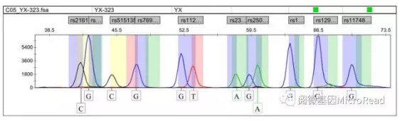 原理:基于荧光标记单碱基延伸原理的分型技术,也称小测序。在体系中加入测序酶,四种荧光标记的ddNTP,紧挨多态位点5,端的延伸引物和PCR产物模板,PCR扩增过程中,引物延伸一个碱基即终止,经ABI测序仪电泳后,根据峰的颜色可知掺入的碱基种类,从而确定该样本的基因型,根据峰移动的位置确定该延伸产物对应的SNP位点。