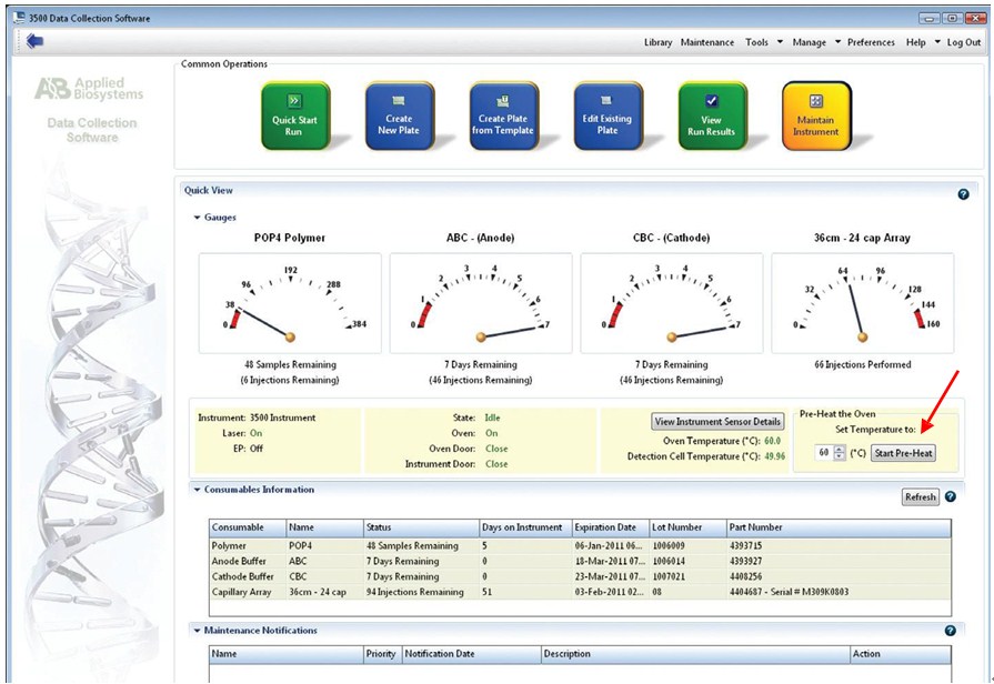 1、 打开3500 Data Collection software,右侧Pre-Heat the Oven下温度设 置为60℃,在第一次电泳之前,点击Start Pre-Heat icon至少预热仪器 30mins。(下图)