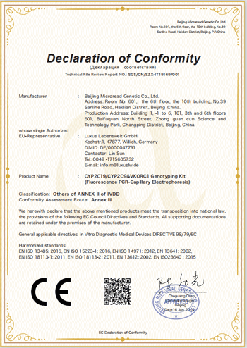 2020年,北京阅微基因技术有限公司(下文简称“阅微基因“)自主研发的体外诊断等系列检测产品CYP2C19/CYP2C9&VKORC1基因检测试剂盒、脆性X综合征检测试剂盒、脊髓性肌萎缩症检测试剂盒等顺利通过欧盟主管当局技术审核,取得了进入欧盟市场的销售通行证,标志着阅微基因的体外诊断试剂产品达到了欧盟国家监管机构的上市要求,对阅微基因集团的发展、尤其是海外市场的开拓带来积极的影响,进一步推进了阅微基因进军国际市场的发展目标。