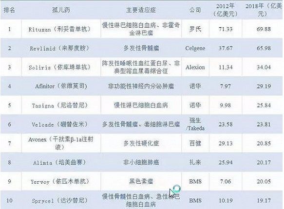 表1 2018年最畅销孤儿药TOP10