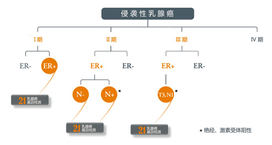 NCCN(美国国立综合癌症网络)今年1月更新乳腺癌指南,21基因检测仍然是其唯一推荐的乳腺癌多基因表达检测项目。推荐用21基因检测进行系统性辅助化疗方案的选择,适用于ER阳性、HER2阴性、pN0或pN1mi(腋窝淋巴结转移≤2mm),临床分期pT1、pT2、pT3,肿瘤组织>0.5cm的浸润性乳腺癌患者。