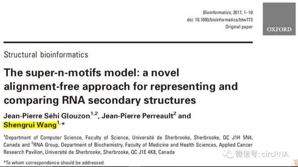 1月14日,Bioinformatics杂志发表了加拿大谢布克大学Wang Shengrui为通讯作者的文章,介绍开发了一种新的预测RNA二级结构的技术:super-n-motifs,该模型能较好的分析诸如seudoknot,G-quadruplex(G-四链体)等结构,也适用于环状RNA。该模型由C++语言写成,适用于Linux系统(Glouzon et al., 2017)。