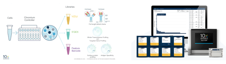 常规免疫组库VDJ测序被广泛的应用于TCR和BCR的多样性研究,但是其无法在单个细胞的水平上完成单细胞α链和β链,或重链/轻链配对信息的精确分析。而10x Genomics Chromium系统利用微流控技术分选单个细胞后将细胞分配到油包水微反应体系中,并通过每个微反应体系中含有的特定DNA标记序列(10x barcode和UMI )来区分不同单细胞和转录本。在对细胞内转录本进行逆转录后,可将cDNA分为3份,其中两份可分别用于构建TCR或BCR免疫组文库,另一份可用于构建5’转录组文库,从而实现在单细胞水平同时对基因转录本和免疫组库进行高通量测序。