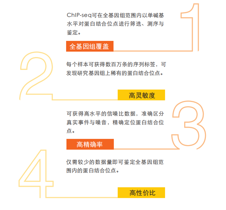 随着新一代测序技术的发展和成熟,染色质免疫沉淀实验与高通量测序的整合,能够高效的在全基因组范围内检测与组蛋白、转录因子等互作的DNA 区段,并且可以基于多个样品进行差异分析。ChIP-seq 是精确、敏感、通量高且成本低廉的方法,可实现目标蛋白在全基因组范围内的全部结合位点的定位与测序。
