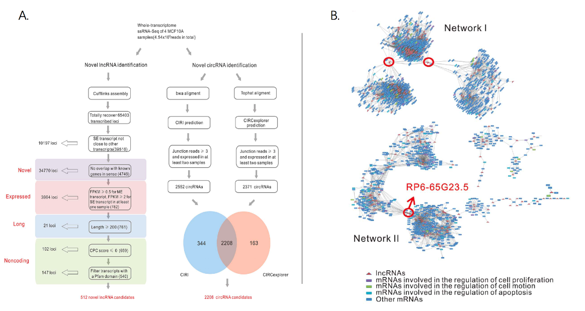 A. 全转录组(lncRNA,circRNA)生物信息学分析流程图(左边为lncRNA测序信息分析流程,右边为circRNA测序信息分析流程)